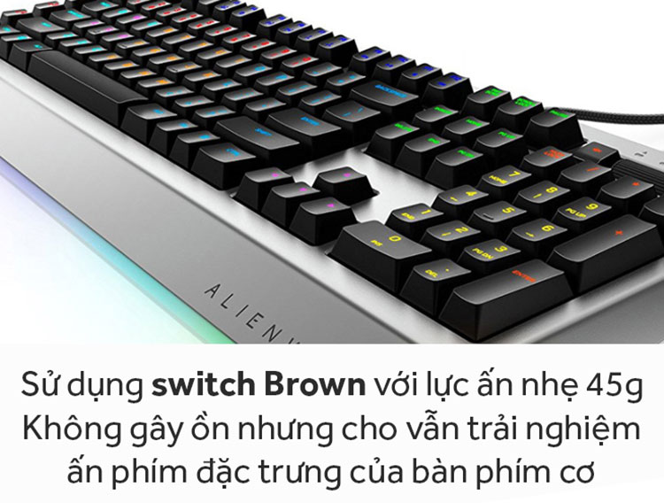 Bàn Phím Cơ Alienware AW768 với thiết kế đặc trưng Alienware mang lại phong cách ấn tượng với 2 vùng đèn nền AlienFX ™ RGB. Người dùng có thể tùy chỉnh bàn phím thông qua Alienware Control Center để có trải nghiệm như mong muốn.