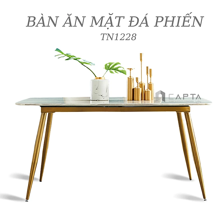 Bàn phòng ăn mặt đá phiến hình chữ nhật có vân đẹp chân mạ màu vàng sang trọng nhập khẩu TN1228-14E TpHCM