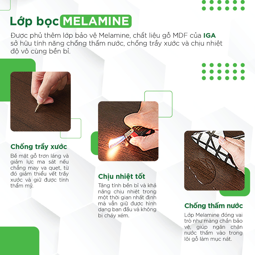 Chất liệu: Mặt bàn sản xuất từ gỗ MDF phủ melamin cao cấp chống xước chống nước.