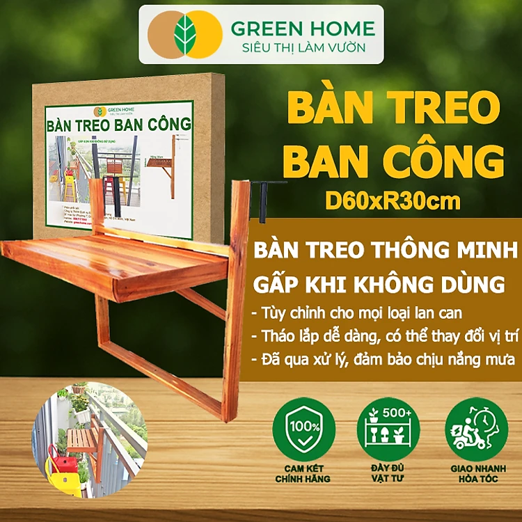 Bàn treo ban công, D60xR30cm, màu gỗ tự nhiên, gỗ tràm, siêu bền, phù hợp mọi lan can |Greenhome