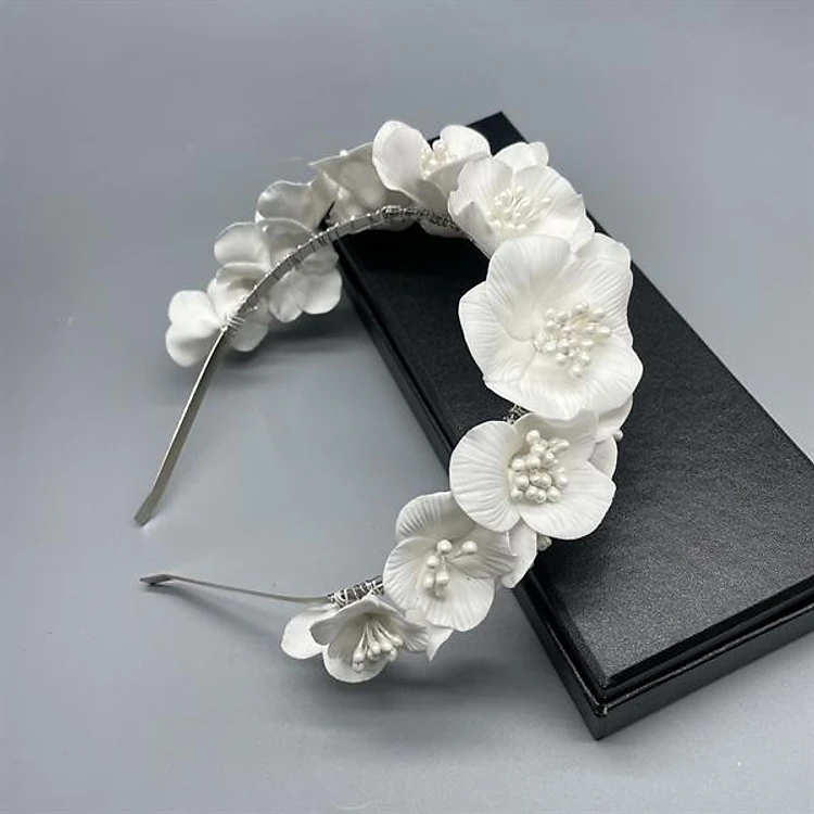 Băng đô cài tóc hoa đất sét trắng thủ công 3d dễ thương cho cô dâu