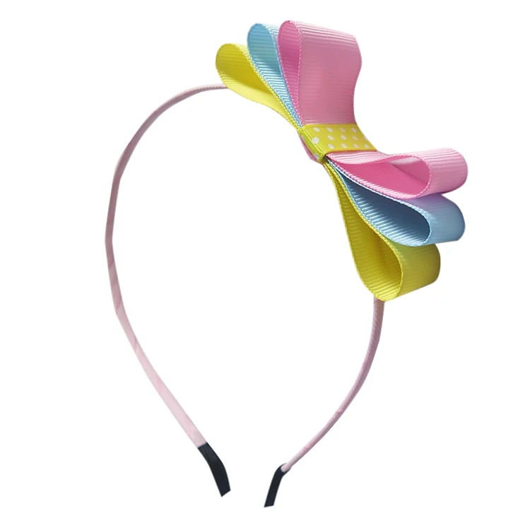 - Băng đô có thiết kế đơn giản, nơ 3 tầng màu hồng, xanh, vàng phối hài hòa được đính một bên đẹp mắt.