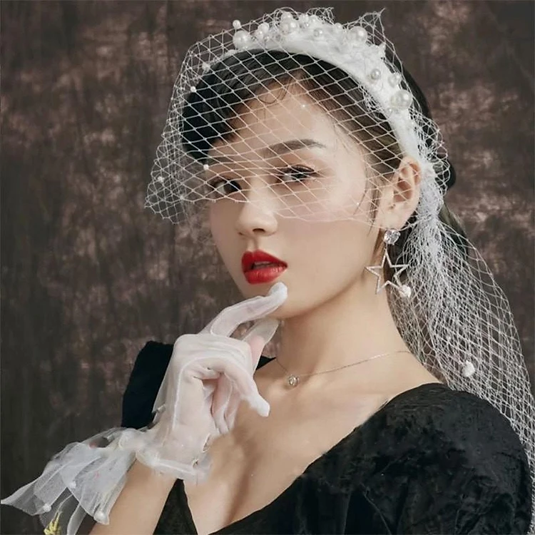 Băng đô nhung cài tóc cô dâu đính hạt trai kèm lưới mạng che mặt Giangpkc SP220547