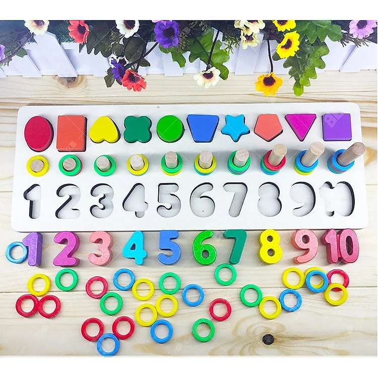 - Bộ sản phẩm bao gồm: 01 bảng gỗ kích thước 41x15,5cm; bộ số từ 1 đến 10; 10 hình khối cơ bản; 10 cọc gỗ kèm theo 55 vòng tròn nhỏ để xỏ vào cọc.
