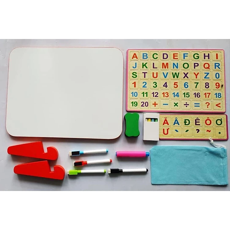 Một mặt có từ tính có thể dùng bút dạ viết lên. Một mặt là bảng đen cho trẻ dùng phấn. Sản phẩm đi kèm với bộ chữ cái có gắn nam châm, bộ số, dấu phép toán, bút dạ, phấn…Với hai mặt bảng này, các bé vừa có thể viết bằng bút dạ, vừa có thể viết phấn.