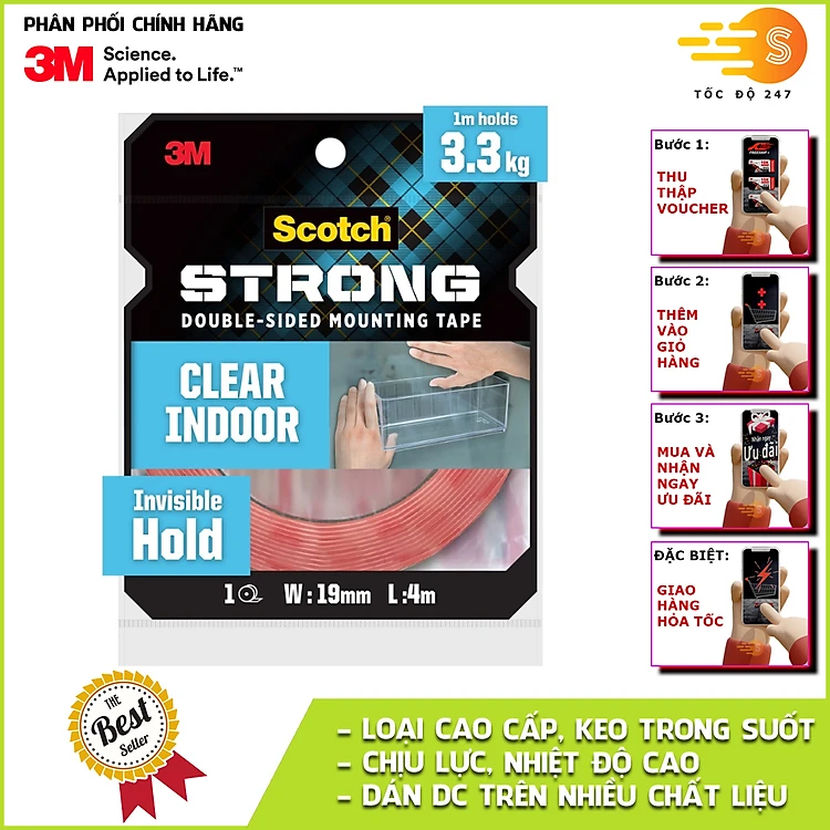 Băng keo 2 mặt trong suốt khổ 19mm Scotch 3M SB-BK410 - Nhiều kích thước, Cường lực, siêu dính, thẩm mỹ