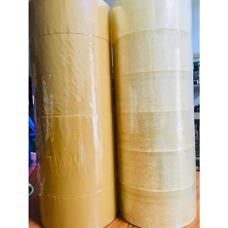 Băng keo sử dụng để dán thùng dài 100y có 2 màu trắng vàng, chất lượng tốt, 1 cây gồm 6 cuộn