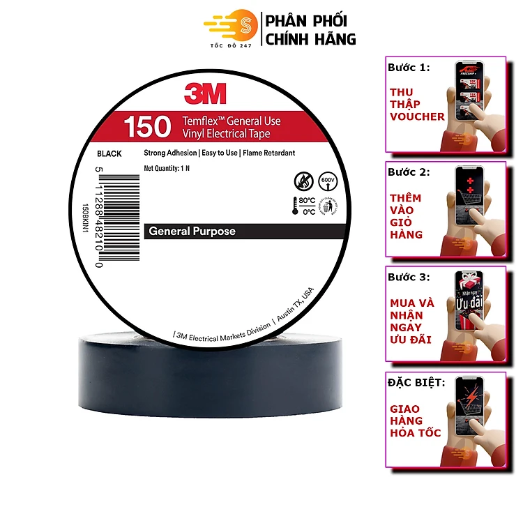 Băng keo điện PVC 3M Temflex 150 18mm x 20m 3M-BK150 - Chống cháy, cách điện tốt, chịu nhiệt cao, sử dụng linh hoạt