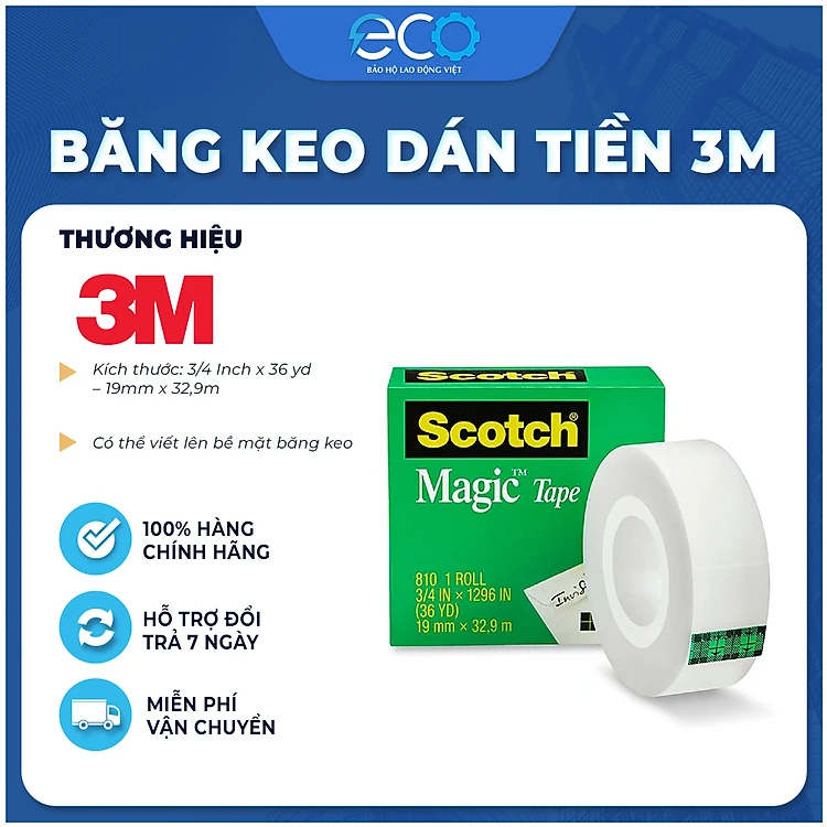Băng keo trong suốt dán tiền và hồ sơ 3M 810 siêu dính, viết lên được, xé được bằng tay (19mm x 33m)