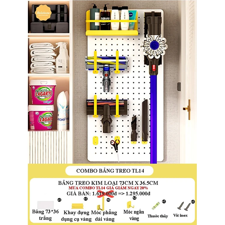 Bảng lỗ Pegboard Dola Home kim loại cao cấp. Kệ để máy hút bụi Dyson, đồ dùng gia đình và dụng cụ vệ sinh nhà cửa