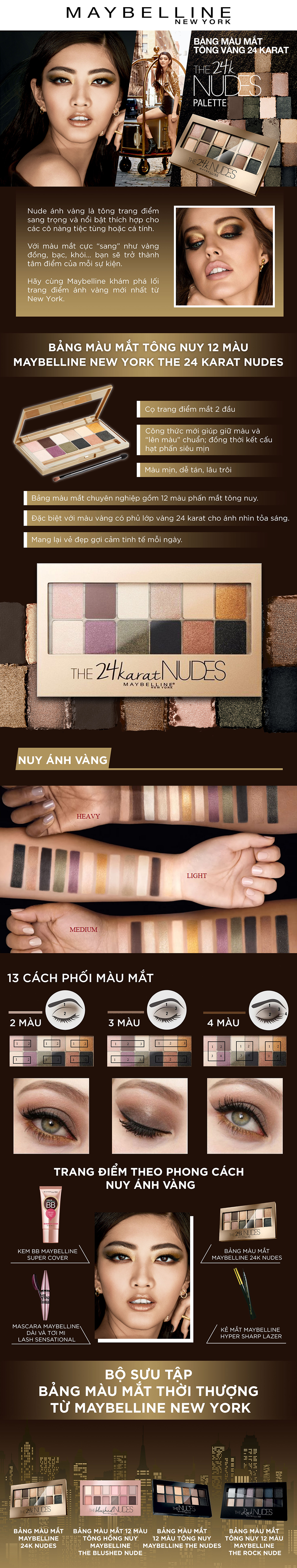 - Bảng Màu Mắt The 24K Nudes Maybelline (9g) gồm 12 màu mắt tông hồng nuy, phù hợp với mọi tông da, mang lại những gam màu dành riêng cho mỗi người.