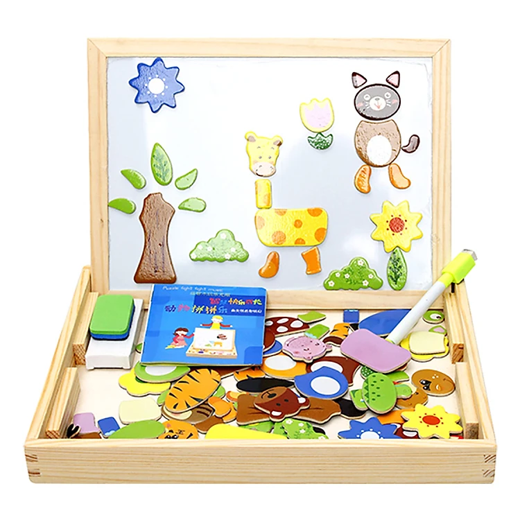 - Cấu tạo gồm 2 mặt bảng ghép đen và trắng, các mảnh ghép có nam châm, bé có thể vừa ghép hình vừa tập viết chữ