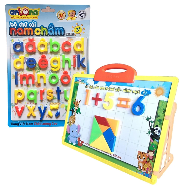 Bộ sản phẩm còn gồm 1 vỉ nam châm chữ thường cho bé học chữ và ghép vần
