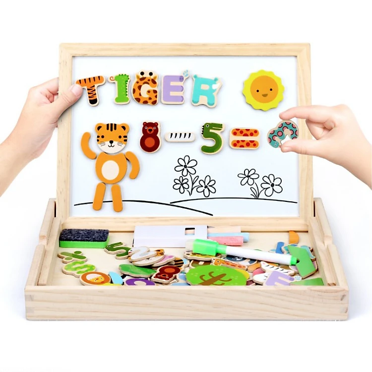 Bảng được làm từ gỗ tự nhiên nguyên khối, dày mịn. Hai mặt đều có thể ghép hình. Một mặt trơn trắng dùng viết lông, một mặt bảng xanh dùng phấn