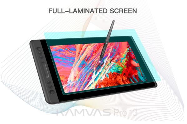 Với Kamvas Pro 13, công nghệ mới nhất bao phủ toàn bộ gương màn hình để liên kết lớp bảo vệ và gương màn hình một cách xuyên suốt, tăng khả năng hiển thị hình ảnh, nổi bật và trải nghiệm cảm giác vẽ trực quan cùng độ chính xác đáng kinh ngạc. Với góc nhìn 178°, Kamvas Pro 13 giảm thiểu độ lệch màu ở ngay cả góc nhìn nghiêng nhất. Kamvas Pro 13 tái hiện hình ảnh rõ ràng, đẹp, hiệu ứng màu sắc tự nhiên và phong phú, loại bỏ hiện tượng thị sai thường gặp tại góc màn hình.