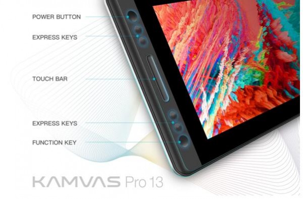 Bảng vẽ màn hình LCD Kamvas Pro 13 có 4 phím tắt ExpressKey và 1 thanh trượt cảm ứng được bố trí cân đối ở cạnh trái. Bạn có thể thiết lập lại các phím tắt để cải thiện hiệu quả công việc của bạn phù hợp với thói quen của riêng bạn. Thanh trượt cảm ứng điều khiển giúp phóng to-thu nhỏ hình ảnh, thay đổi kích cỡ nét cọ, chuyển đổi trang, mang lại cho người dùng những trải nghiệm ấn tượng trong quá trình sáng tạo.