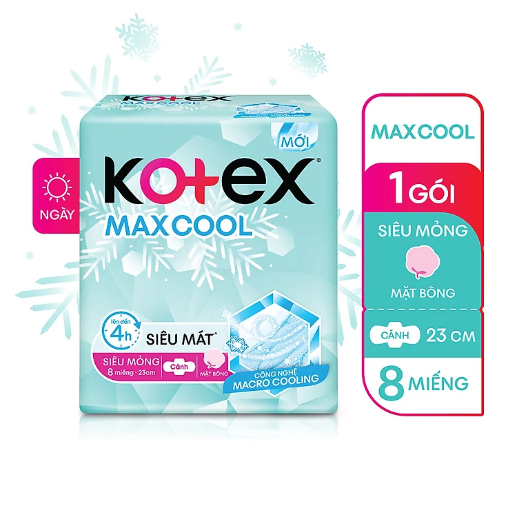Kotex Max Cool đột phá - mát lạnh dài lâu, kéo dài hàng giờ. Nhờ vào công nghệ MACRO COOLING với hàng triệu phân tử làm mát đối lưu không ngừng, đem đến cảm giác mát lạnh liên tục – kéo dài lên đến 4 giờ.