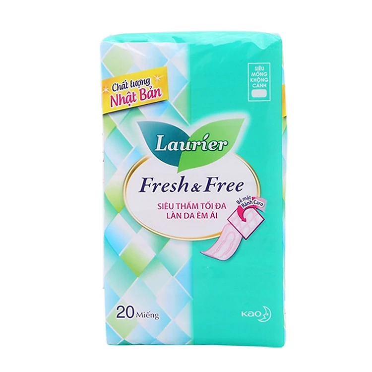 - Băng Vệ Sinh Laurier Fresh & Free Siêu Mỏng Cánh - 20 Miếng mang đến cảm giác êm dịu và thoải mái tuyệt vời trên da, với lớp thấm hút có bề mặt nổi, các sợi tơ nhân tạo mảnh và lớp màng thông khí giúp thoát ẩm, giúp bạn luôn có cảm giác khô ráo và thoáng mát.