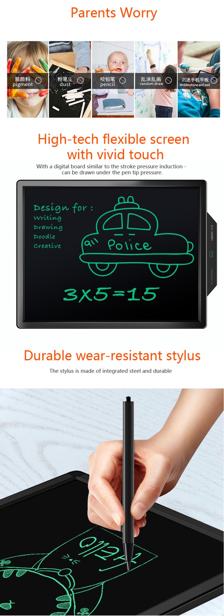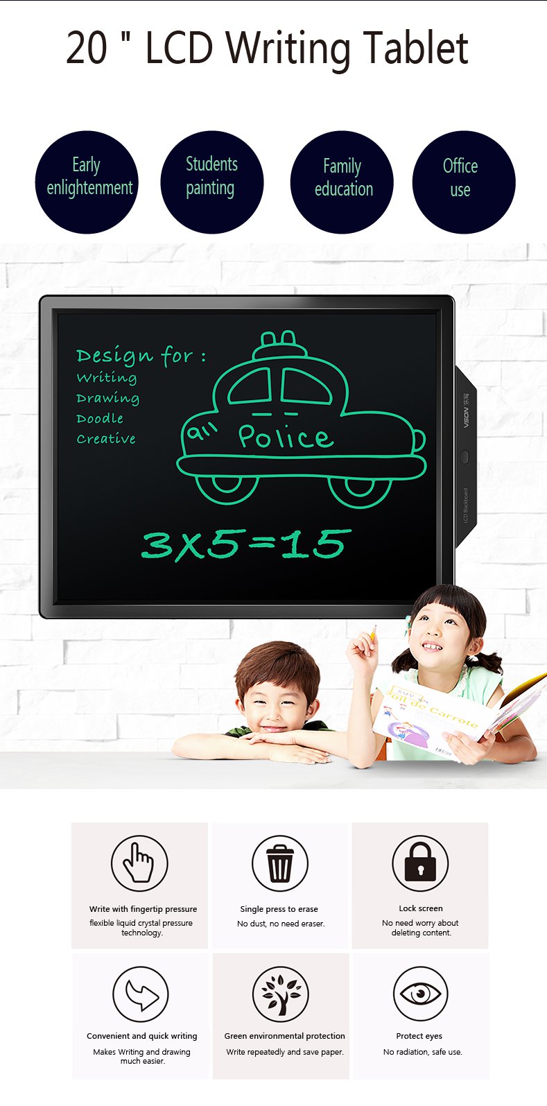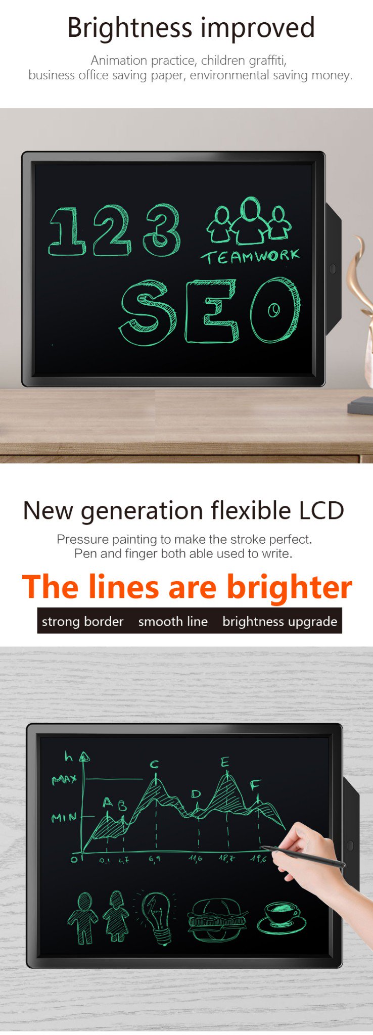 - Màn hình LCD có kích thước cực lớn trên khuôn khổ 20 inch được thiết kế không có đèn nền nhưng ánh sáng mạnh hơn chiếu xạ bên ngoài giúp bề mặt bảng viết rõ ràng hơn. Thuận tiện cho bạn có thể ghi chép, viết vẽ hơn.