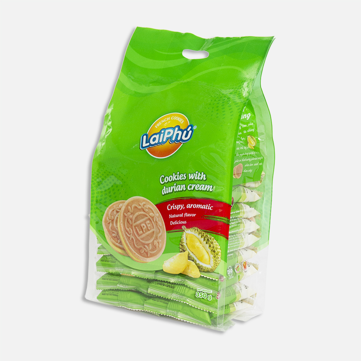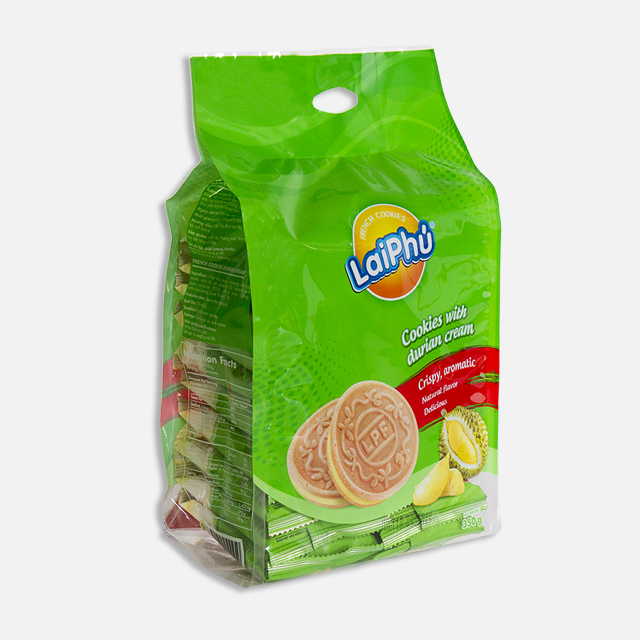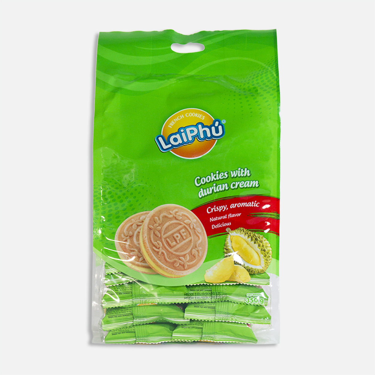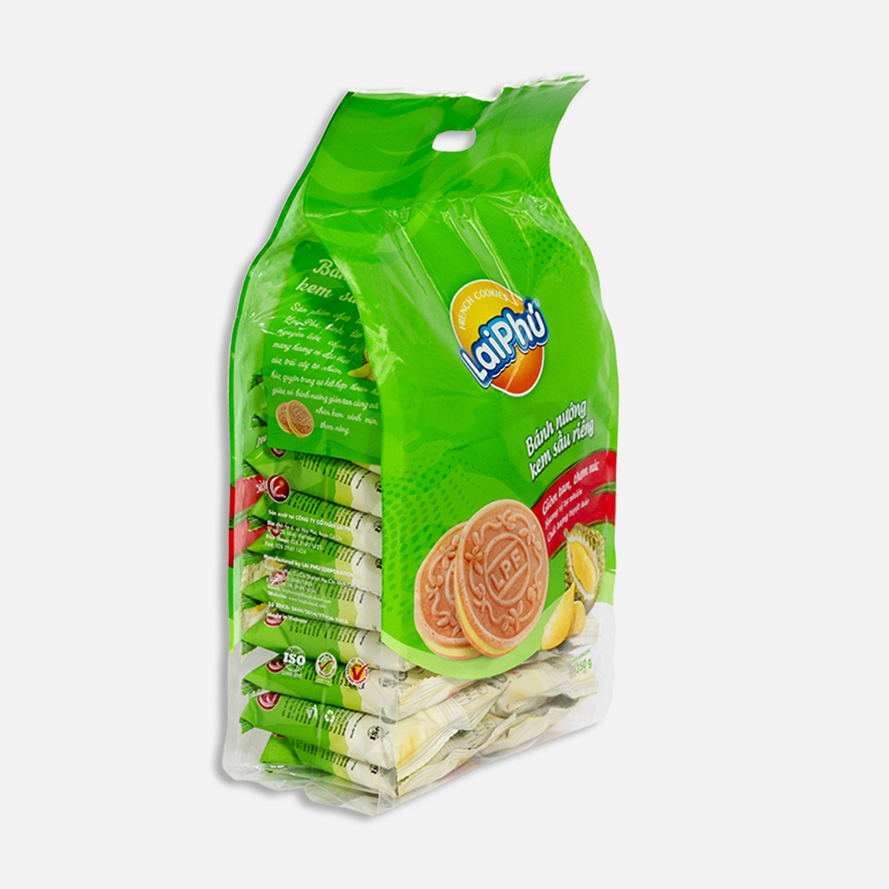 Thành phần: Bột mì, đường cát trắng, shortening, bơ, bột trứng, bột sữa nguyên kem, muối, sầu riêng (0.5%), chất tạo xốp (natri bicacbonat (500ii)), hương sầu riêng tổng hợp, màu thực phẩm tổng hợp (Sunset Yellow (110)).
