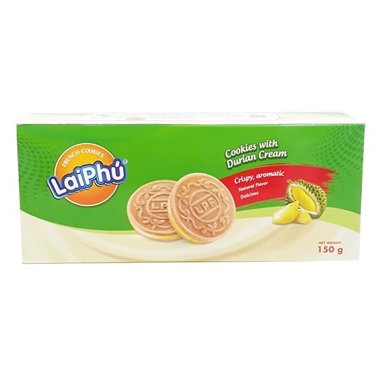 Bánh French Cookies Lai Phú kem sầu riêng Lai Phú (150g) được chế biến và đóng gói theo quy trình công nghệ tiên tiến, đạt vệ sinh an toàn thực phẩm.