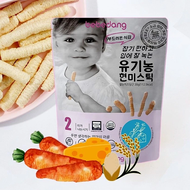 - Bánh gạo ăn dặm Bebedang là sử dụng trên 98% gạo hữu cơ xuất xứ Hàn quốc được trồng trên đất không sử dụng thuốc sâu, phân bón hóa học trong vòng trên 3 năm, và chỉ sử dụng phân hữu cơ, không chất bảo quản, không hương liệu.