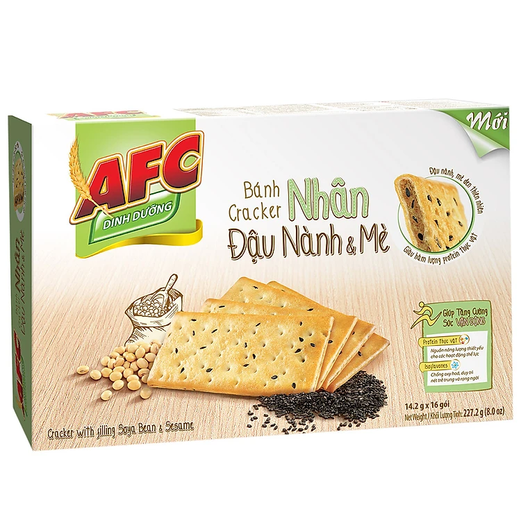 Bánh AFC nhân đậu nành và mè giữ trọn vẹn nguồn dưỡng chất và hương vị thơm ngon từ đậu nành, mè đen. Lượng protein dồi dào trong đậu nành, mè đen giúp bạn tràn đầy năng lượng, dưỡng chất Isoflavornes thiên nhiên ngăn ngừa lão hóa da. Thưởng thức AFC nhân đậu nành mè mỗi sáng hoặc ăn thay bữa nhẹ buổi chiều sẽ giúp bạn bổ sung dinh dưỡng cho cả ngày dài năng động.
