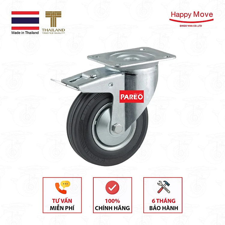 Bánh xe đẩy cao su đen càng xoay 360 có khóa 80-100mm - Happy Move Thái Lan