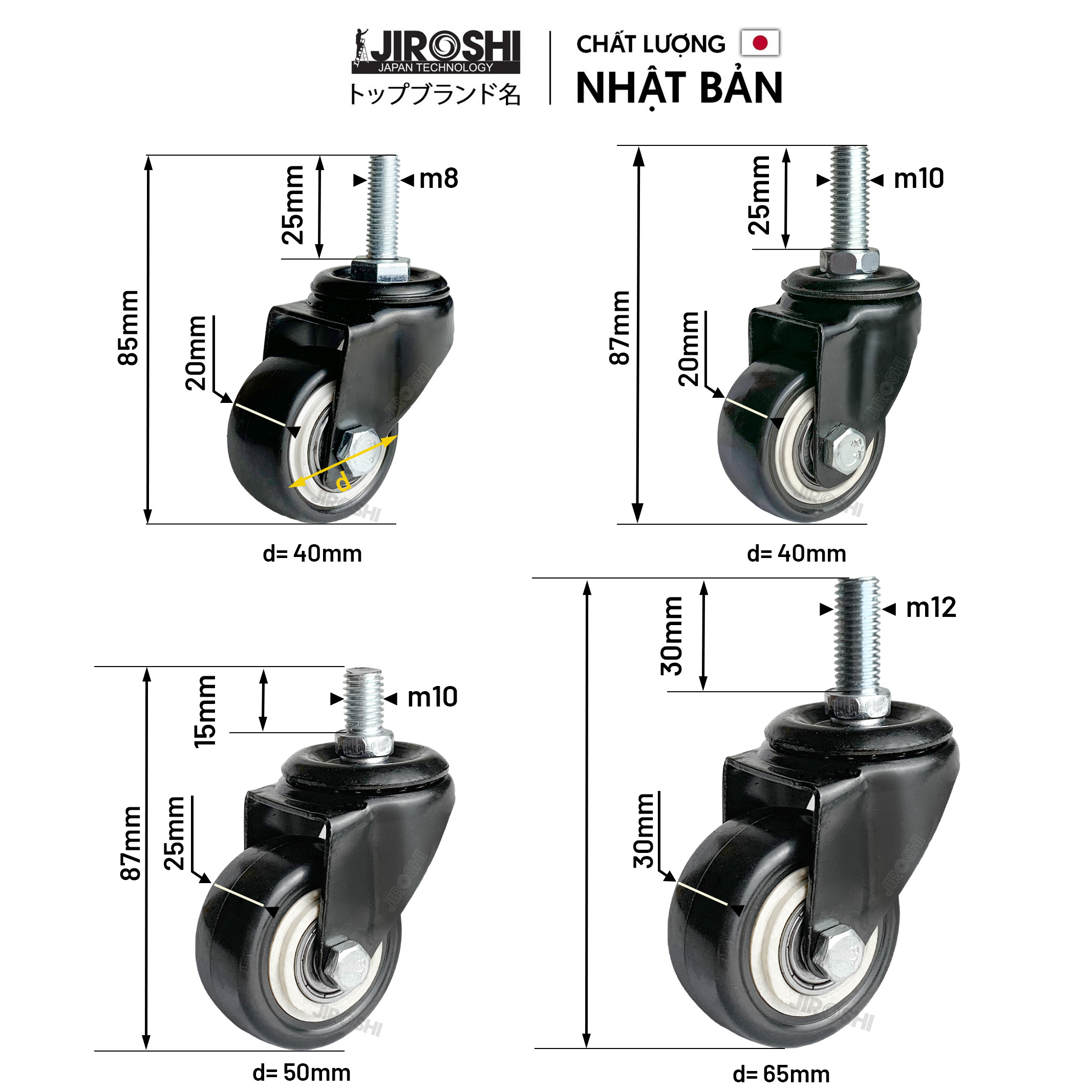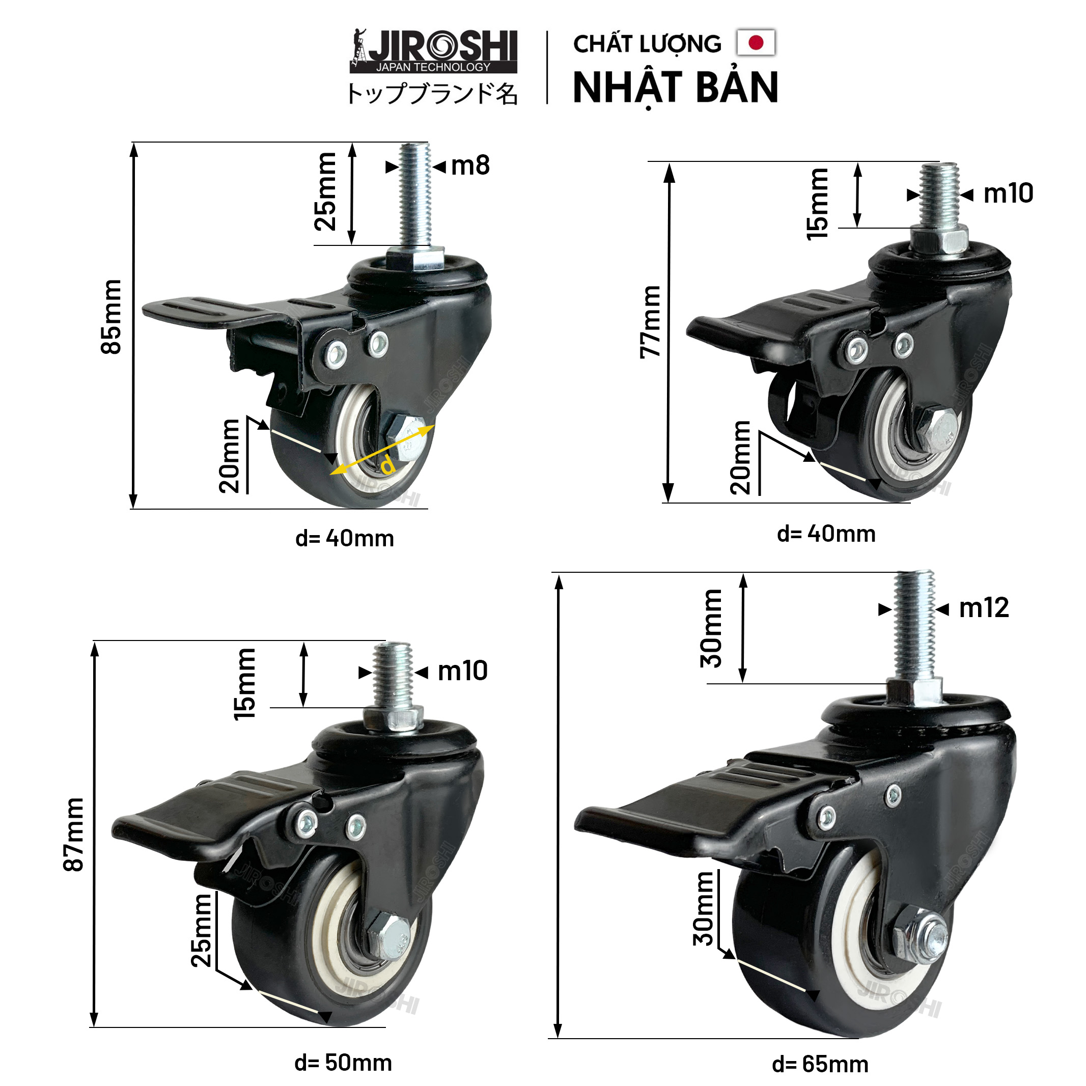 Bánh xe đẩy hàng mini ty ren M8 M10 M12 JIROSHI, bánh xe công nghệ Nhật Bản, bánh 40mm