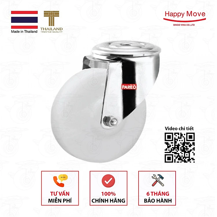 Bánh xe đẩy nylon trắng (PA) nanotech càng lỗ xoay Inox 304 - 80-100-125mm - Happy Move Thái Lan