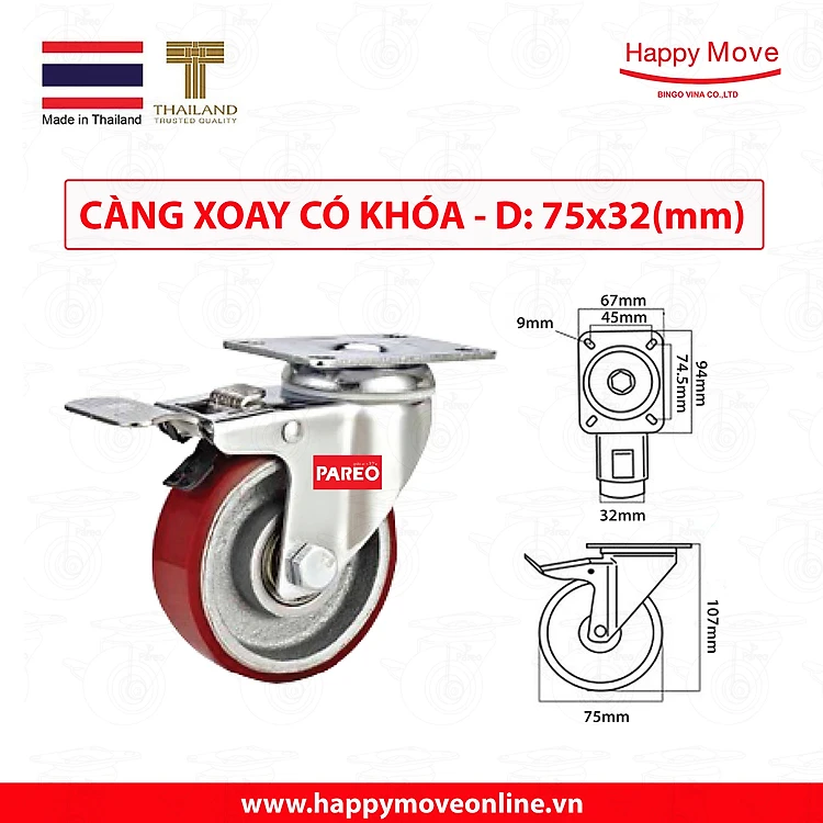 Bánh xe đẩy PU cốt gang càng xoay 360 có khóa 75-100-125mm - Happy Move Thái Lan