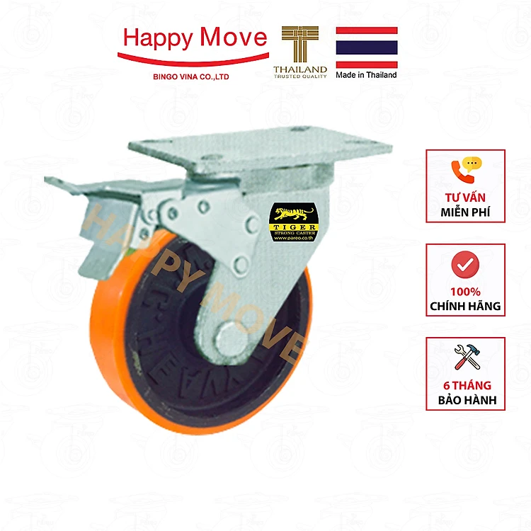 Bánh xe đẩy siêu tải PU càng xoay khóa kép 150mm - Happy Move Thái Lan