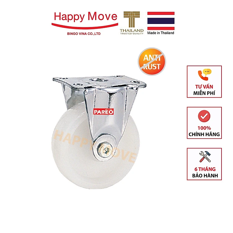 Bánh xe nylon tải nhẹ inox 304 càng cố định 50-65-75mm - Happy Move Thái Lan