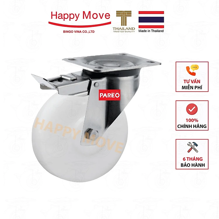 Bánh xe nylon trắng (PA) càng Inox 304 xoay có khóa kép - 80-125mm - Happy Move Thái Lan