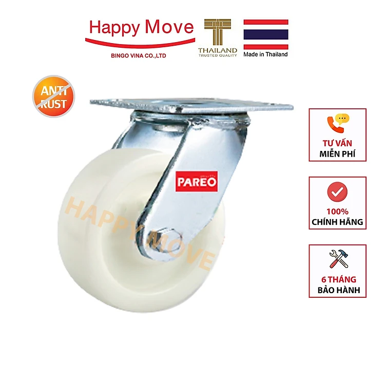 Bánh xe nylon trắng tải nặng càng Inox 304 xoay 360 độ - 100 - 125 - 150 - 200mm - Happy Move Thái Lan