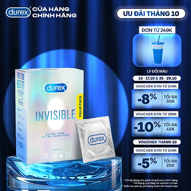 Bao Cao Su Durex Invisible Siêu Mỏng, Size 52 mm, Hộp 16 Bao Mới Ra Mắt - Hộp Lớn Siêu Tiết Kiệm