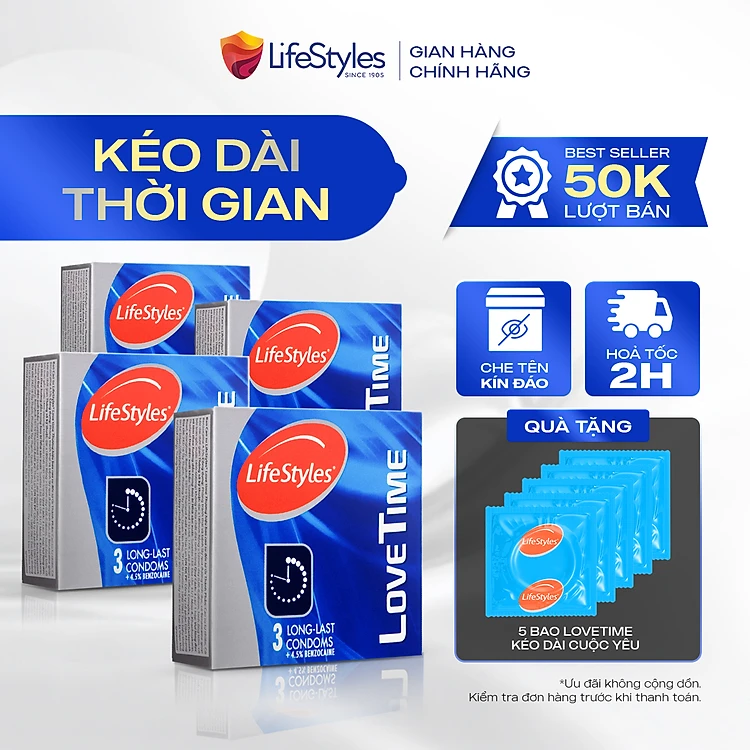 Bao Cao Su Kéo Dài Thời Gian LifeStyles Love Time Thiết kế Ôm Sát Nhiều Gel 100% Không Rách Bao - Hộp 3 bao