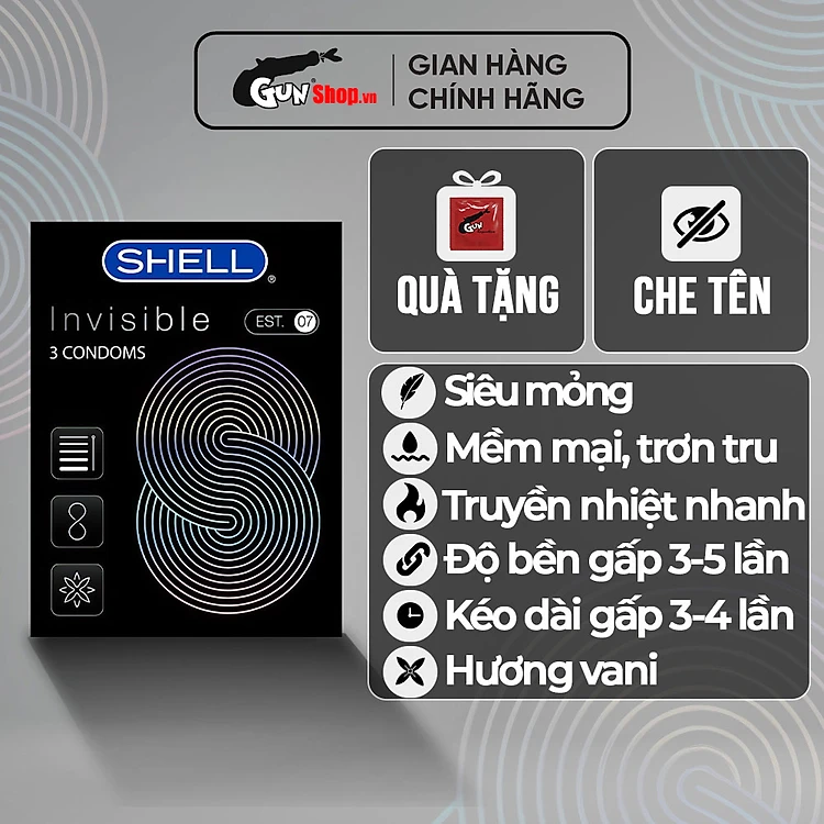 Bao cao su Shell Invisible - Siêu mỏng, chống tuột, kéo dài thời gian - Hộp 3 cái