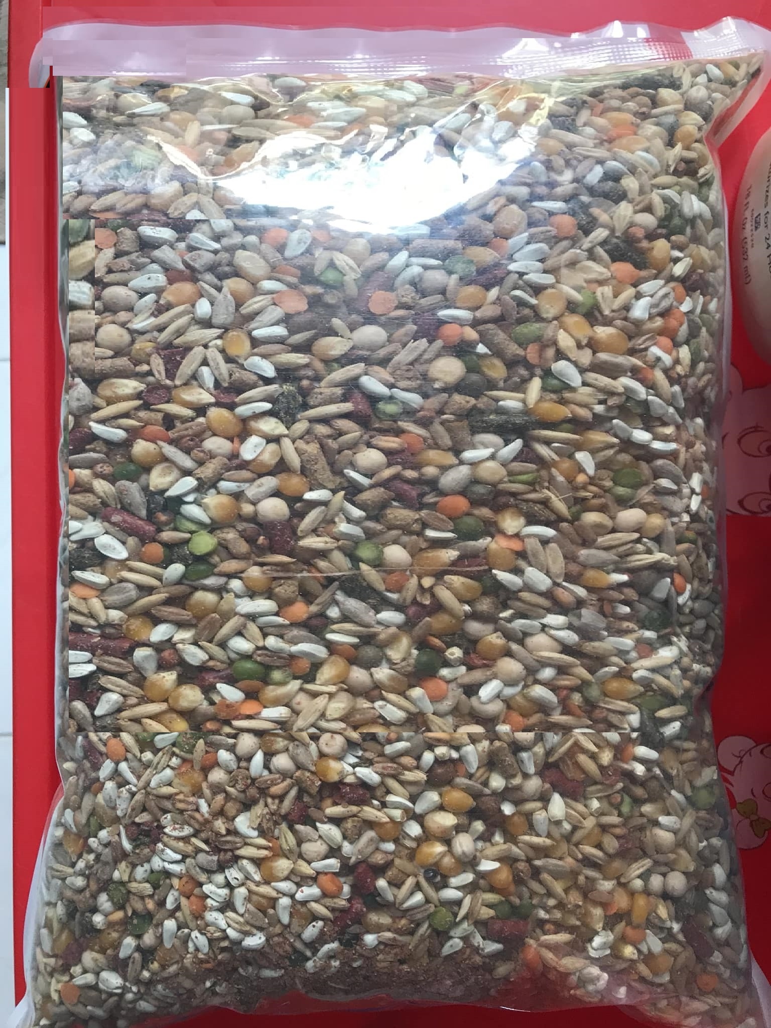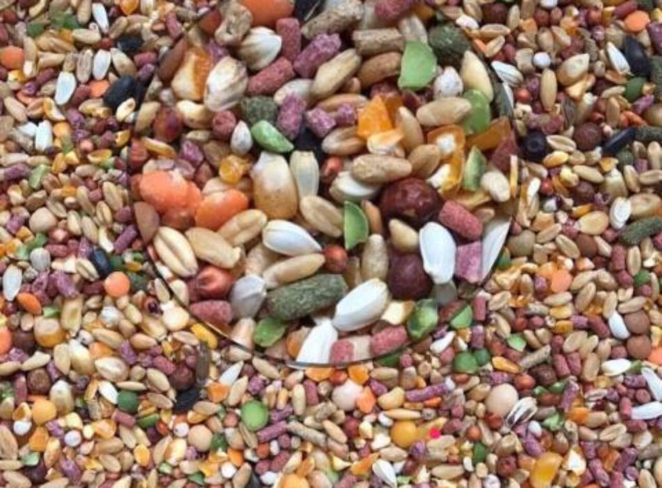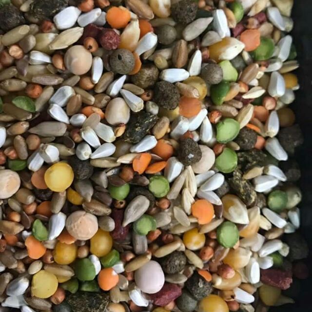 + Thành phần bao gồm: Lúa mì, gạo lức, yến mạch, đậu xanh, bắp sấy, hạt hướng dương, hạt cây thích, hạt Calfmana, đậu nành, đậu hà lan, đậu lăng đỏ, bột cỏ, cành hoa Rum khô, linh lăng ướp muối và phơi khô, rau củ thủy, lúa, bobo, đậu đỏ, kê đỏ, cám viên.