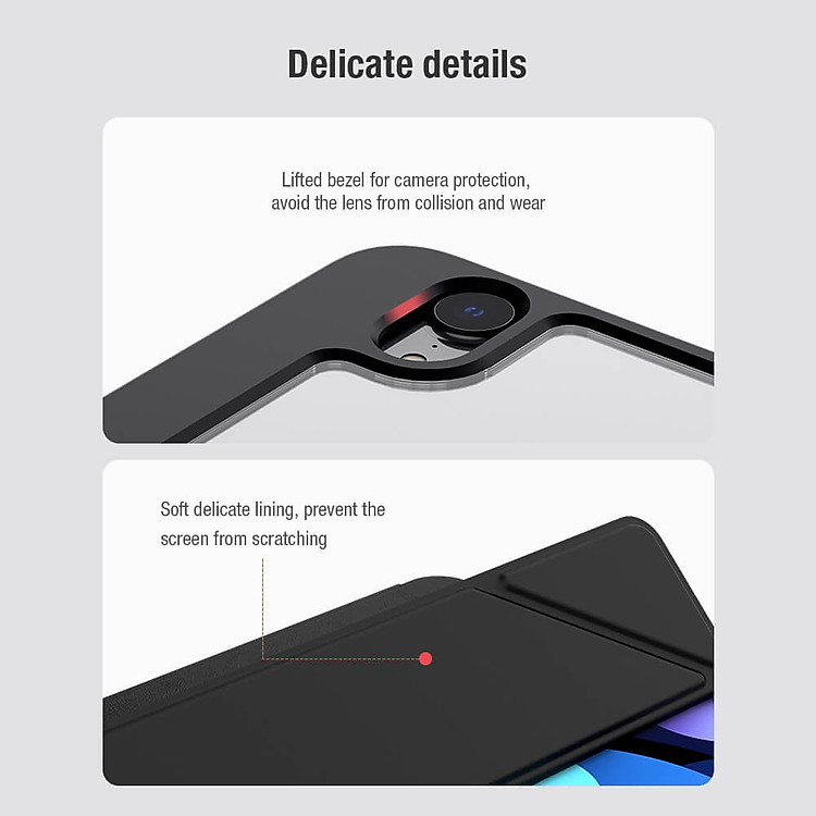 Bao da chống sốc cho iPad Mini 6 hiệu Nillkin Bevel có ngăn đựng bút có trang bị gờ bảo vệ giúp bảo vệ camera của chiếc iPad Mini 6 tránh bị trầy xước va chạm và chống bụi bẩn.