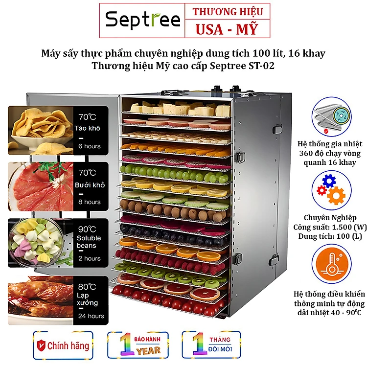 Máy sấy thực phẩm 16 khay inox 100 Lít Thương hiệu Mỹ Septree ST-02, Công suất 1500W - Hàng nhập khẩu (Bảo hành 12 Tháng)