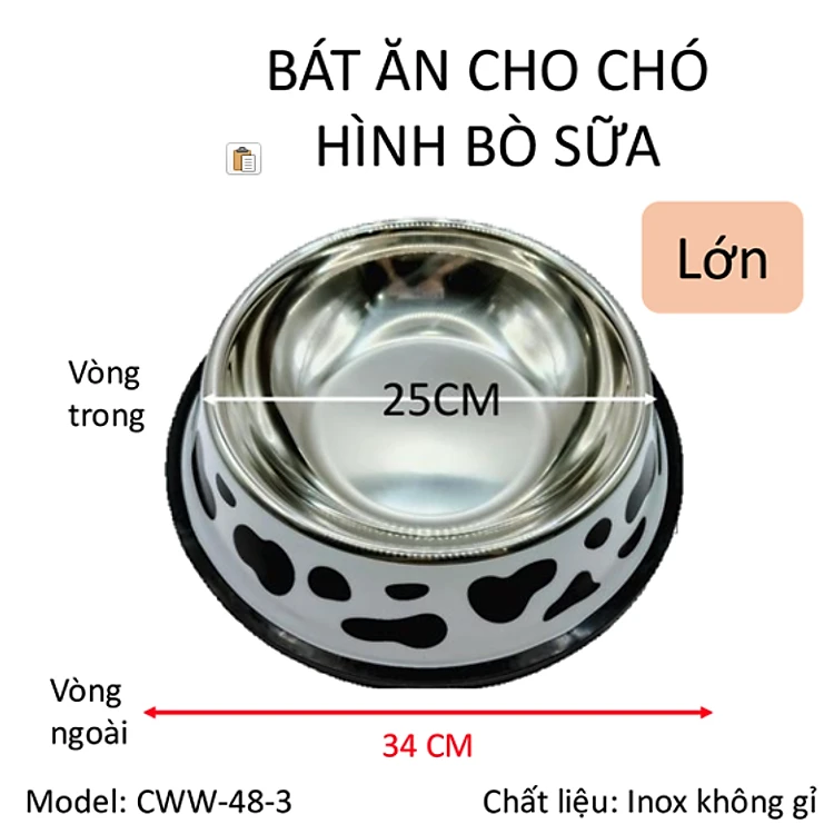 Bát ăn thú cưng, bát ăn chó mèo hình bò sữa, chất liệu inox an toàn sử dụng cho vật nuôi. Bát có 3 kích thước 18cm, 26cm, 34cm. Bát ăn size lớn 34cm
