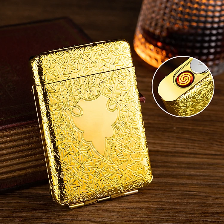 Bật Lửa Điện Kiêm Hộp Đựng Thuốc 16 Điếu Lớn Ngắn Đồng Thau Hoa Văn Cổ