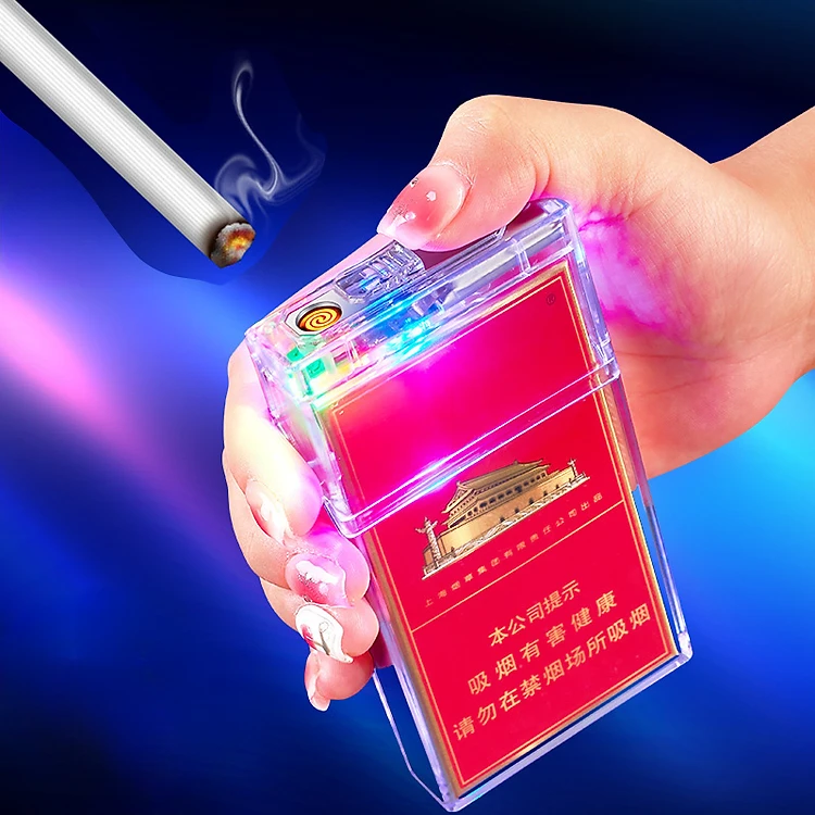 Bật Lửa Điện Kiêm Hộp Đựng Thuốc 20 Điếu Dài sLIM Trong Suốt Có Đèn - Sạc Điện