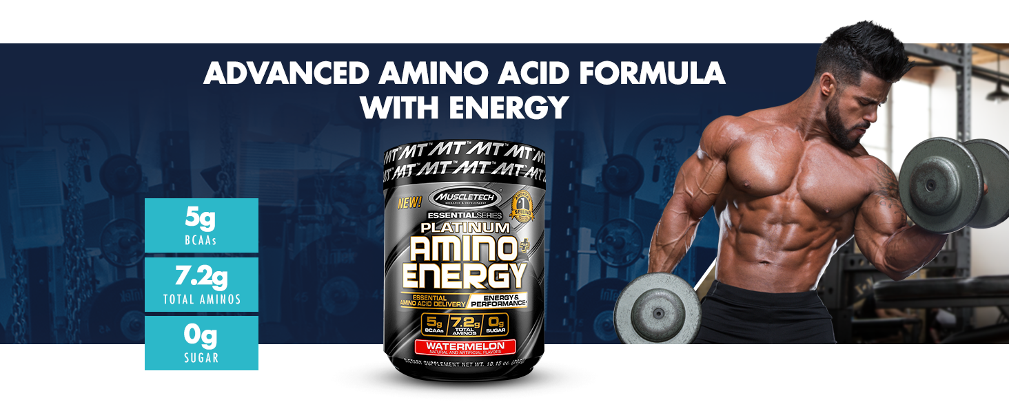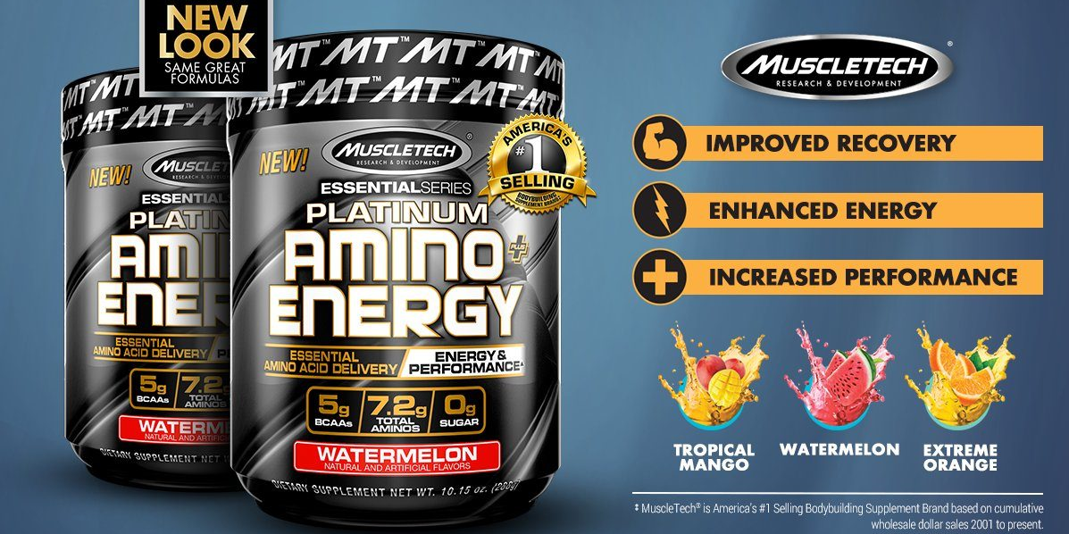 BCAA Platinum Amino Plus Energy của Muscle Tech hương Tropical Mango (XOÀI) hộp 30 lần dùng hỗ trợ tăng sức bền, sức mạnh, đốt mỡ giảm cân mạnh mẽ, phục hồi cơ nhanh chóng cho người tập GYM và chơi thể thao thao