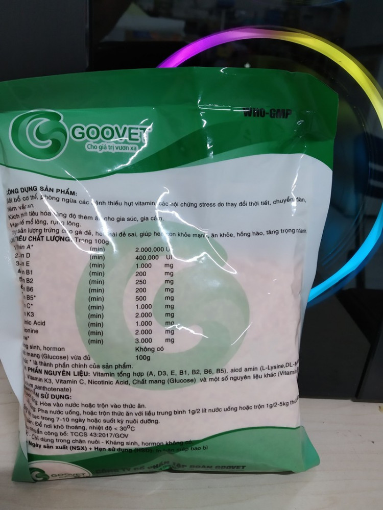 Thành phần nguyên liệu: Vitamin tổng hợp (A, D3, E, B1, B2, B6, B5), aicd amin (L-Lysine,DL-Methionine), Vitamin K3, Vitamin C, Nicotinic Acid, Chất mang (Glucose) và một số nguyên liệu khác (Vitamin B12 và Cacium panthotenate)