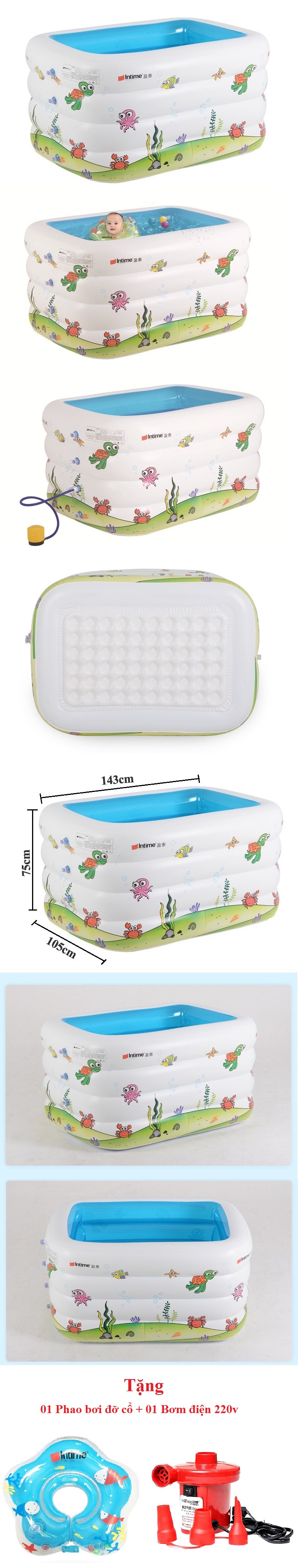 - Bể bơi phao cho trẻ sơ sinh với hình ảnh của đại dương thu nhỏ sau khi bơm có kích thước chiều dài 1m43, rộng 1m05 cao 75cm cho bé tha hồ vùng vẫy trong làn nước trong lành.