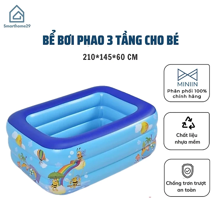 Bể bơi phao cho bé chữ nhật 2m10 x 1m45 x 65cm, Bể tắm bơm hơi trong nhà 3 tầng dày dặn, bền đẹp, đáy 2 lớp chống trơn trượt - Chính hãng MINIIN (Giao họa tiết, mẫu ngẫu nhiên)
