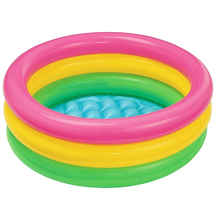 Bể bơi được thiết kế 3 màu vàng, hồng, xanh đẹp mắt, mỗi tầng là một van riêng biệt an toàn và chắc chắn. Kích thước 86 x 25cm, đáy bể bơm hơi tạo cảm giác êm ái cho bé khi ngồi.
