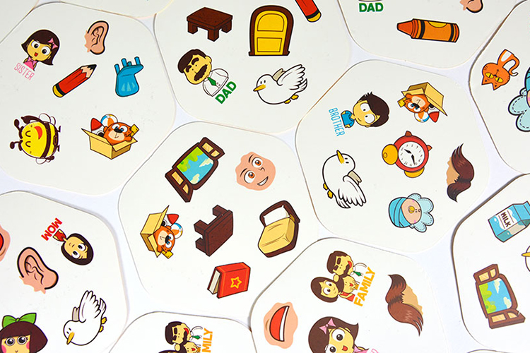 • Thành phần mỗi bộ trò chơi bao gồm: 62 thẻ chơi, mỗi thẻ có 6 hình tương ứng với 6 từ vựng, 1 tờ đọc tên tương ứng với 62 từ vựng, có cả tiếng Anh và tiếng Việt, 1 tờ hướng dẫn chơi, với 3 cách chơi cơ bản có thể áp dụng ngay.